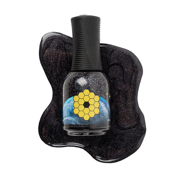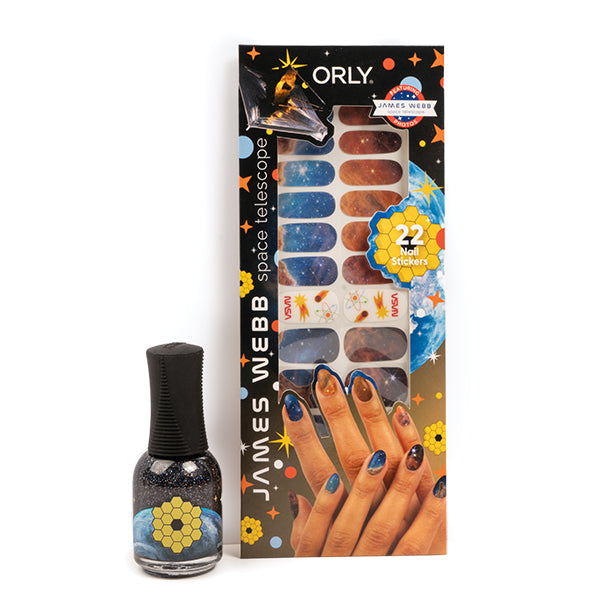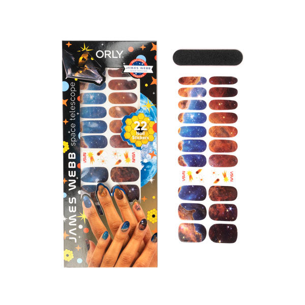 Anyone out there? Dive deep into outer space with a galactic shimmer paired with real images from the James Webb space telescope. Just remember to come back to Earth when you rock these long lasting nail stickers with an iridescent black glitter!